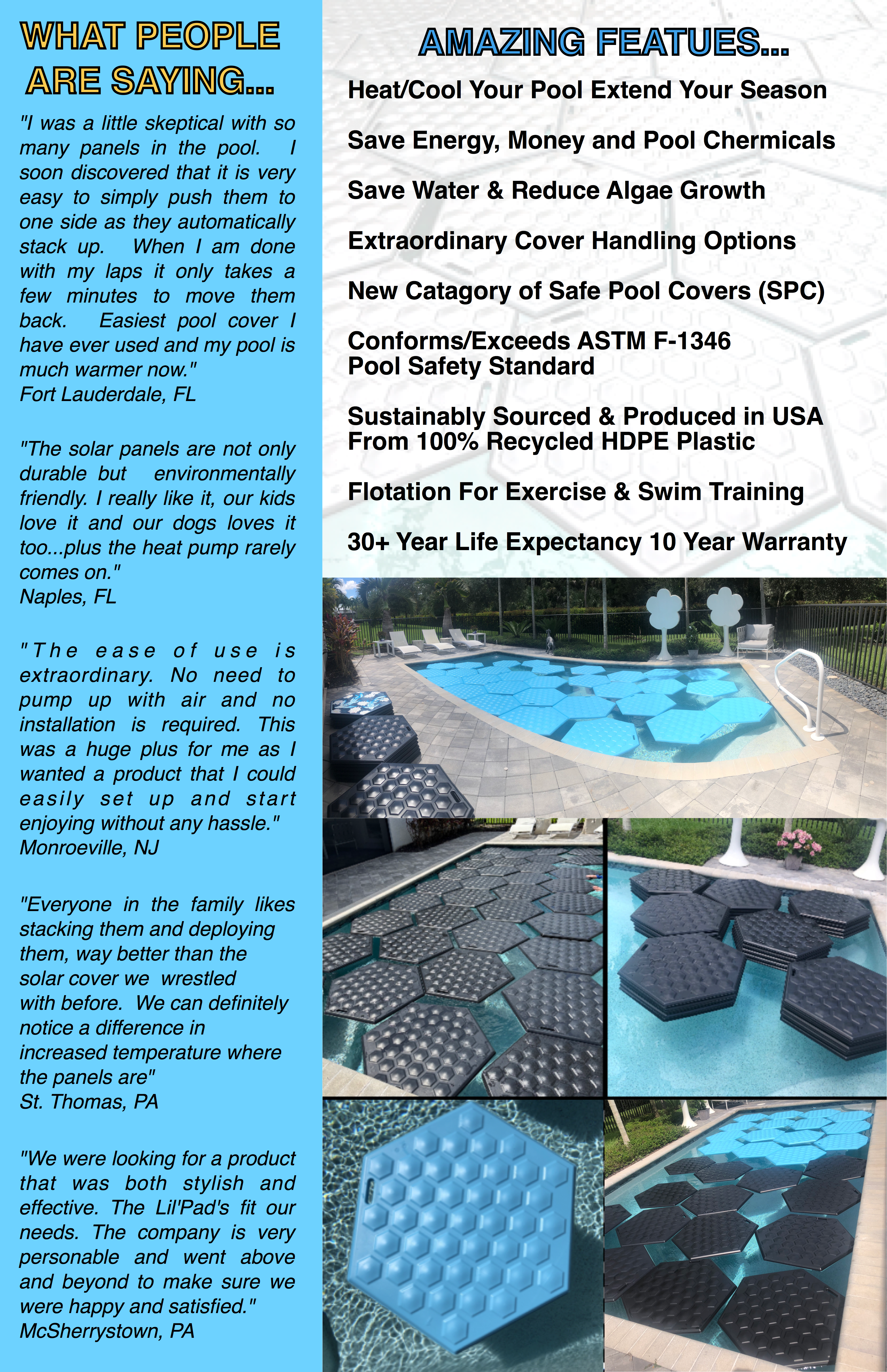 Lil’Pad™ stands out with its Augmented Surface Area, delivering exceptional heating efficiency that maximizes your return on investment (ROI). While some Lil'Pad™ images may showcase 65-90% pool coverage, 30-50% coverage is all it really takes for Lil'Pad™ to keep your pool warmer day and night vs. 100% coverage of a Vinyl Bubble Cover. The 100% SunBlock of the Lil'Pad™ also interrupts Photosynthesis greatly reducing Algae Growth. The 30+ Year Life Expectancy, Safe Easy Handling, Superior Heating Performance and Algae control makes it a clear winner over the short-lived Vinyl Bubble Covers, which often end up in landfills within a few years and can’t possible compete with Lil’Pad™ for long-term value, performance and handling.